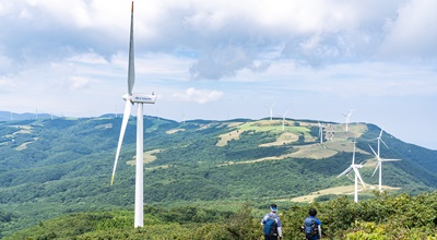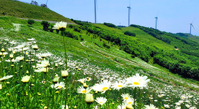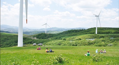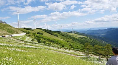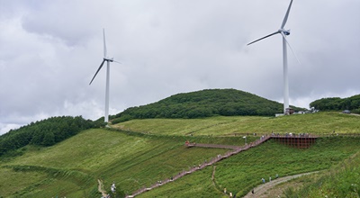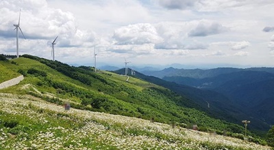 선자령은 산 이름인데, 높이가 1,100m 정도 돼요. 여기를 어떻게 올라가나 고민하실 수 있는데, 걱정하지 않으셔도 돼요. 산 입구가 이미 해발 800m가 넘거든요. 조금만 올라가든 금방 정상에 올라갈 수 있어요. 정상에 올라가면 이러한 풍광이 펼쳐져요. 풍차길이 워낙 아름다워서 걷기 훌륭한 곳이며 선자령 트레킹은 겨울에도 유명해요.