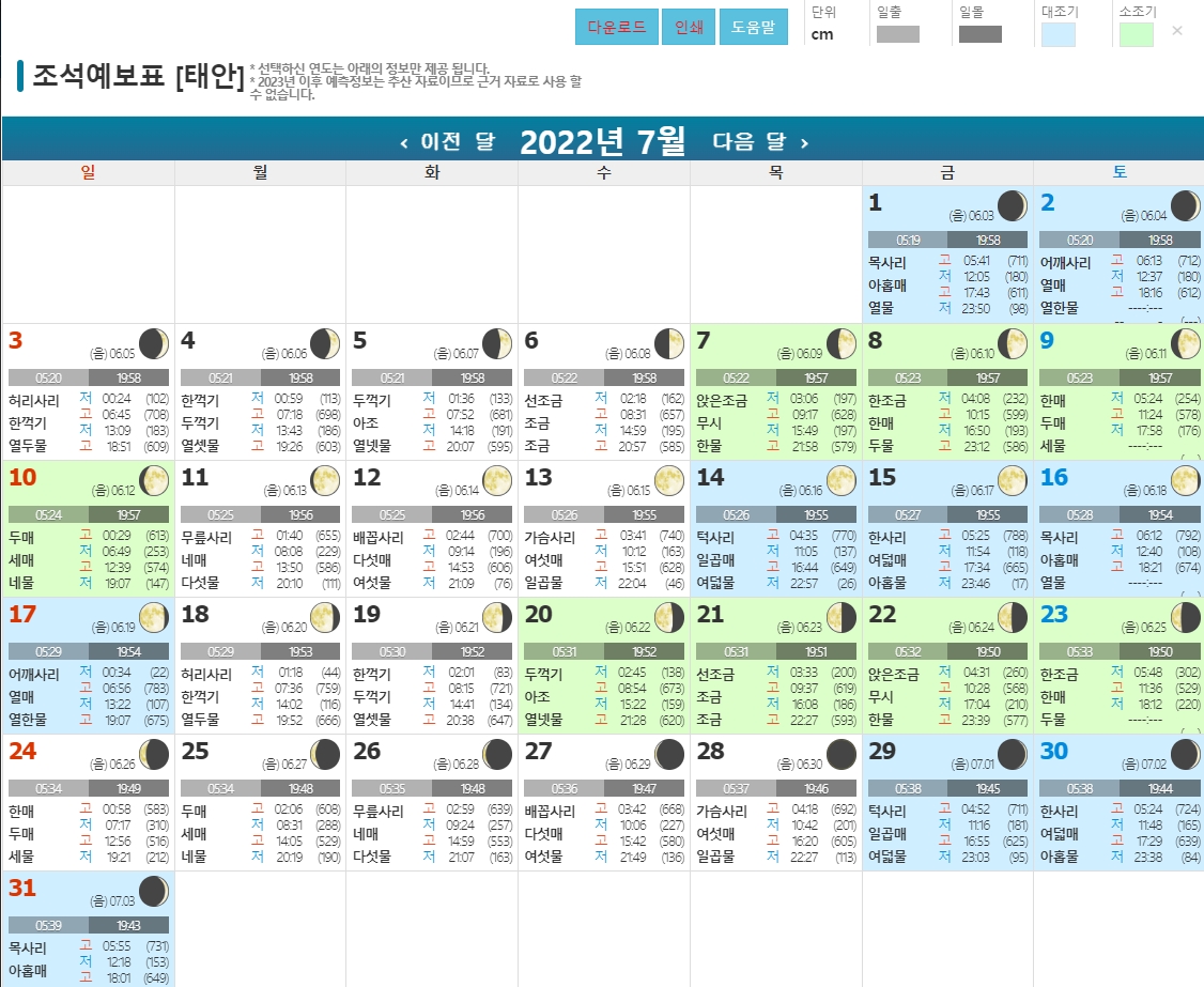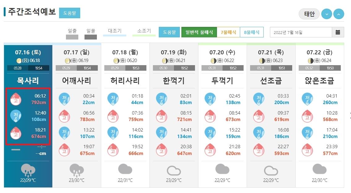 아래로 내려가시면 해당 지역의 주간 물때표를 확인할 수 있어요. 날이 갈수록 물때 시간이 조금씩 바뀌는이게 보이실텐데 해루질을 할 경우 물 높이가 낮은 시간을 확인해야 하는데 활동하고자 하는 적당한 시간과 맞는 날짜를 선택하셔서 여행 가시는게 좋을 것 같습니다.