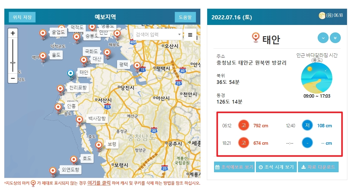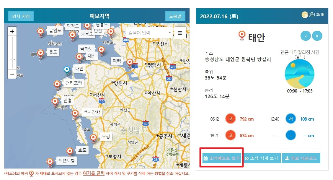 먼저 위 사이트 방문하시면 아래 그림과 같이 지도가 뜨는데 여기서 확인하고자 하는 지역을 선택하시면 해당 지역의 정보가 뜨게 돼요. 저는 많이 여행가시는 태안을 눌러봤어요.
