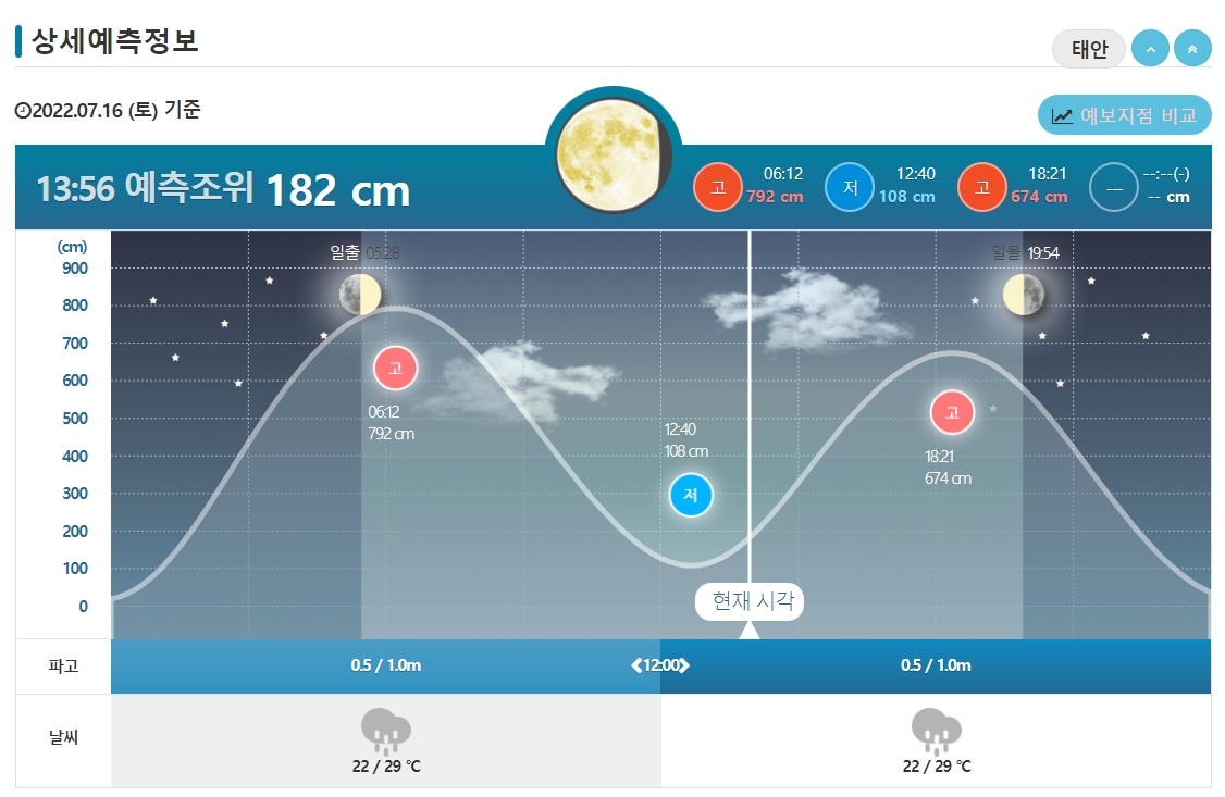 태안의 오늘 일자의 물때표를 볼 수 있습니다. '고'라고 되어 있는 것이 수면이 높아지는 시간이고 '저'라고 되어있는것이 수면이 낮아지는 시간이지요. 오늘 기준으로 가장 높은 시간은 6:12, 18:21 이며 낮은 시간은 12:40 이지요.