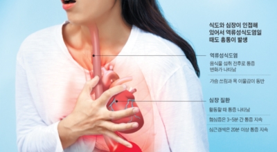 그래서 문제는 이렇게 식도 부위에 해당하는 정가운데 부위가 아니더라도 왼쪽 또는 오른쪽으로 가슴의 통증을 일으키는 경우도 있다고 하고 특히나 오른쪽 가슴 밑에 명치 부위가 답답한 경우가 많겠습니다. 그렇기 때문에 구역감, 속 쓰림, 위산 역류 등을 확인하고 특히나 쉰 목소리 또는 목의 이물감 등을 느끼는 경우들이 많으므로 면밀히 확인해 보는 것이 좋을 것 같습니다.