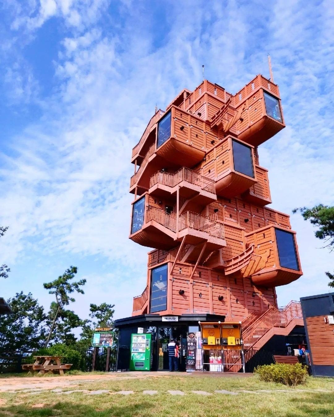 하지만 정상에 올라오면 이순신 장군이 명량대첩에서 승리 후 전열을 가다듬었던 고하도의 수려한 해상 풍광을 충무공의 얼을 담은 13척의 판옥선 모형을 격자형으로 쌓아 올린 전망대에서 감상할 수 있다고 하며 2층부터 5층까지는 전망대 또는 목포관광을 소개하는 전시 공간이고 5층 전망대는 사방이 탁 트인 구조로 되어있으며, 한쪽에는 판옥선의 지붕 같은 주조물이 있어 비나 뜨거운 햇빛을 피하여 구경할 수 있겠습니다.