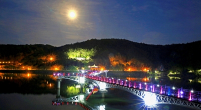다리 한가운데에는 월영정(月映亭)이 있어요. 월영교는 안동의 야경명소로 한 부부의 아름답고 숭고한 사랑이 간직되어 있는 나무다리로 우선 간 남편을 위해 머리카락을 뽑아 한 켤레의 미투리를 지은 지어미의 애절하고 숭고한 사랑을 기념하고자 미투리 모양을 담아 다리를 지었다고 전해져요.